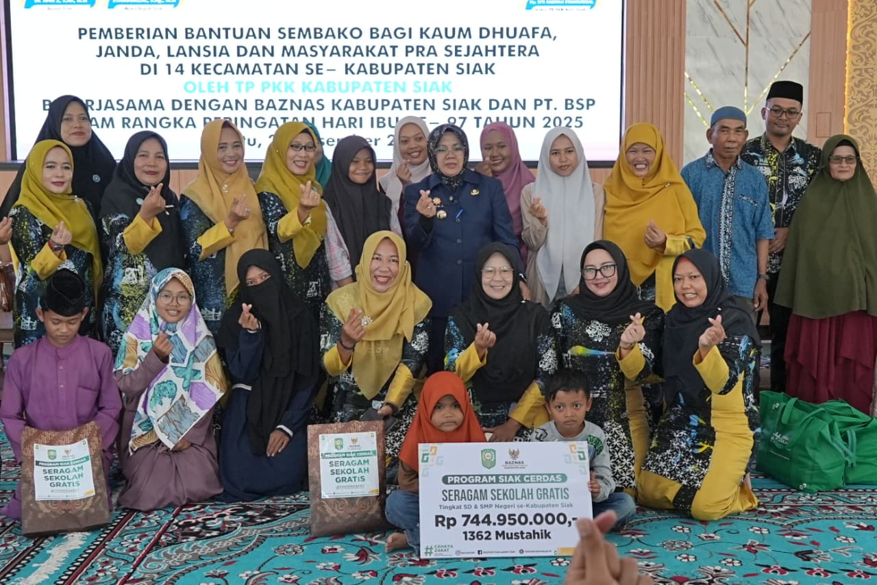 SIAK,LIPUTANREDAKSI.COM- Dalam semangat Hari Ibu ke-97 Tahun 2025, TP PKK Kabupaten Siak bersama BAZNAS Kabupaten Siak dan PT. Bumi Siak Pusako menyalurkan bantuan sembako kepada kaum dhuafa, janda, lansia, serta masyarakat prasejahtera di 14 kecamatan se-Kabupaten Siak.