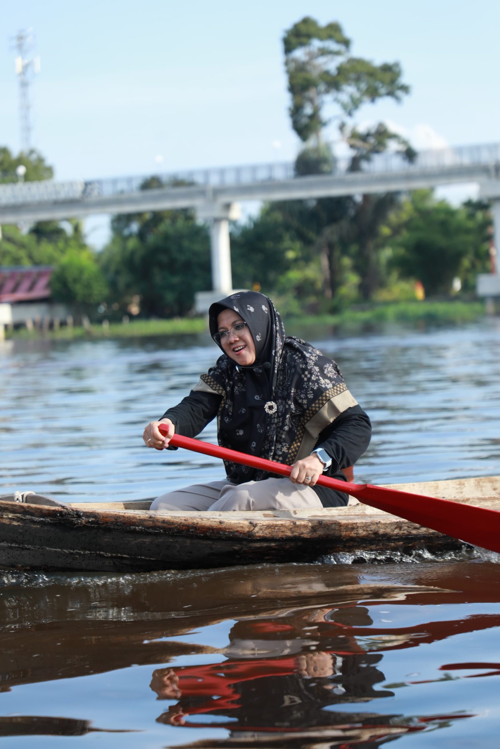 Dengan wajah penuh semangat, Bupati Afni yang didampingi 2 orang peserta lomba dayung tradisional, berhasil mendayung sampan menyeberangi sungai Siak.